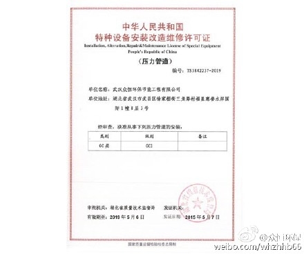 Install license GC grade pipeline issued by quality and Technical Supervision Bureau of Hubei province express warm congratulations on the company!