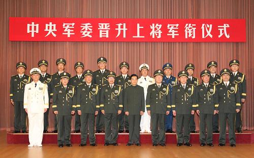 Xinhua Beijing, 19 July Xinhua (reporter Cao Zhi) the Central Military Commission, 19 in the Beijing eight one building held a grand ceremony of rising admiral military rank. Chairman of the Central Military Commission, Hu Jintao to promotion to Admiral comrades issued orders.