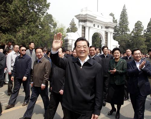 In April 20th, Tsinghua University celebrate its 100 anniversary, the general secretary of the CPC Central Committee, President, chairman of the Central Military Commission Hu Jintao came to Tsinghua University to study. This is Hu Jintao at Tsinghua University's most iconic old in front of the school gate to the teachers and students waved. Xinhua News Agency reporter Ju Peng perturbation