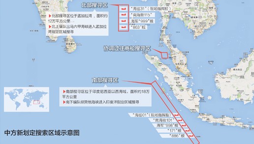 中國海軍新聞發(fā)言人梁陽(yáng)18日說(shuō),海軍將認真貫徹習主席和中央領(lǐng)導同志指示精神,按照“兵分兩路、兩線(xiàn)作戰、穩扎穩打、向前搜救”的要求,加強與相關(guān)部門(mén)的溝通協(xié)調,以更快速度、更大力度,做好搜索工作。中國“海巡01”輪現場(chǎng)指揮部18日晚介紹,所有參與搜索的中方艦船預計于19日上午在新加坡附近海域集結,然后將兵分南北兩路趕赴任務(wù)海區,開(kāi)始第二階段的搜索任務(wù)。根據方案,南路編隊由五艘艦船組成,經(jīng)巽他海峽進(jìn)入印度洋指定區域,搜索區面積約18萬(wàn)平方公里;北路編隊由四艘艦船組成,出馬六甲海峽進(jìn)入孟加拉灣指定區域,搜索區面積約12萬(wàn)平方公里。