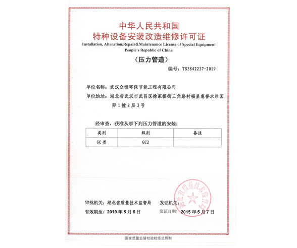 快訊 熱烈祝賀公司獲得湖北省質(zhì)量技術(shù)監督局頒發(fā)的GC級壓力管道安裝許可證!