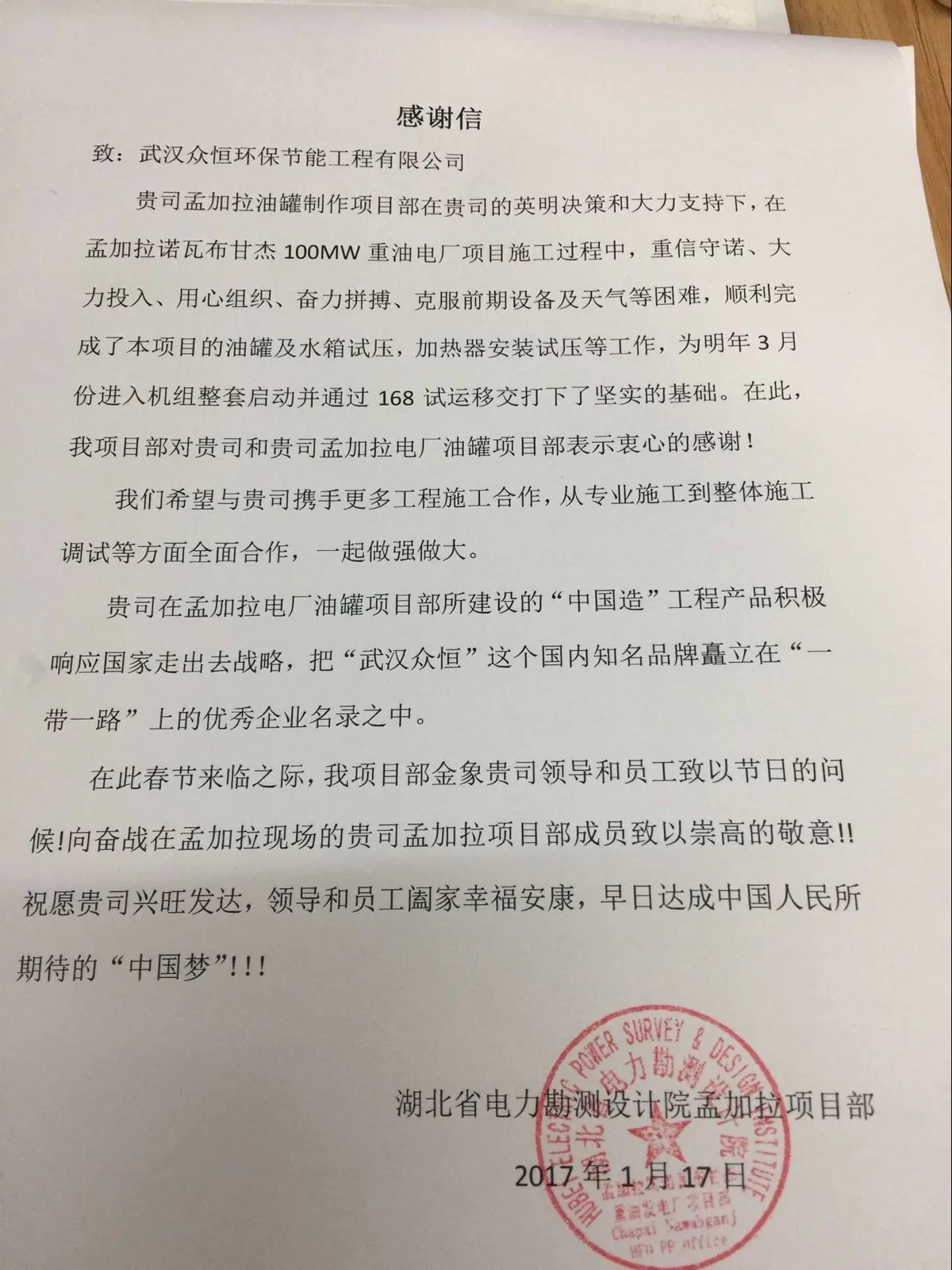 快訊 武漢眾恒環(huán)保節能工程有限公司承建的孟加拉電站項目11臺大型油罐和水箱工程獲得業(yè)主一次性驗收通過(guò)!同時(shí)武漢眾恒環(huán)保節能工程有限公司還收到了湖北電力勘測設計院孟加拉項目部的至誠感謝信,他們盛贊我們孟加拉項目部全體員工的優(yōu)異表現,重信守諾、吃苦耐勞、奮力拼搏的精神。并將武漢眾恒環(huán)保節能工程有限公司項目現場(chǎng)的圖片置放到湖北電力勘測設計院的官網(wǎng)上進(jìn)行展示和宣傳,并提出希望與我們公司更美好的合作遠景宏圖!