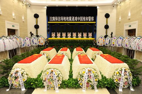 新華社快訊:向海地地震遇難中國維和警察遺體送別儀式9時(shí)在八寶山革命公墓禮堂舉行。禮堂正廳上方懸掛“沉痛悼念海地地震遇難中國維和警察”橫幅,下方擺放8位烈士遺像。