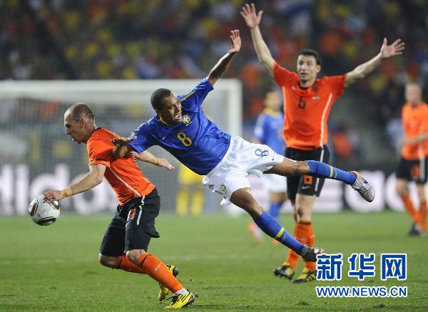 北京時(shí)間7月2日22點(diǎn),第19屆南非世界杯展開(kāi)首場(chǎng)1/4決賽爭奪。在伊麗莎白港曼德拉灣球場(chǎng),荷蘭隊逆轉2-1擊敗10人巴西隊率先殺入四強,并將國際A級比賽不敗紀錄擴大到24場(chǎng),歷史上第4次闖入世界杯半決賽,并就此終結了桑巴軍團A級賽事10場(chǎng)不敗記錄。第10分鐘,梅洛精準直塞,羅比尼奧插上大禁區邊緣掃射破門(mén)。第53分鐘,梅洛自擺烏龍讓荷蘭追平。第68分鐘,斯內德接庫伊特擺渡球頭槌破門(mén)反超比分。第73分鐘,梅洛踩踏羅本被紅牌驅逐。