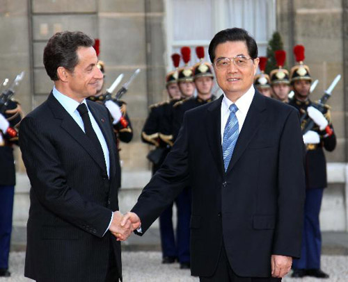 胡錦濤:“我和薩科齊總統一致同意,中法應該共同努力,賦予中法關(guān)系新的內涵,發(fā)展互利、成熟、穩定、面向全球的中法全面戰略伙伴關(guān)系,為發(fā)展新形勢下平等伙伴大國發(fā)揮積極影響!