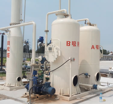 儲運過(guò)程產(chǎn)生的含烴氣體進(jìn)入活性碳床層,其中的油氣吸附在活性碳表面,凈化后的氣體直接排放大氣,吸附的油氣經(jīng)過(guò)真空泵解吸排入分離器,在分離器中,油氣進(jìn)入吸收塔,被塔頂噴淋的汽油所吸收。油氣吸附在常溫、常壓下進(jìn)行,脫吸則在真空狀態(tài)下實(shí)現,分別進(jìn)行吸附和解吸,切換操作,保證裝置的連續運行。油氣吸收率可達到99%,排放氣體含烴量低,滿(mǎn)足嚴格的油氣排放標準要求,適用于石化企業(yè)及中、小規模油庫的油品貯存和裝運。